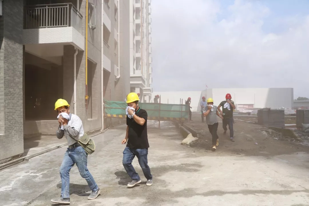 演練小組動力組迅速到現場切斷電源,各組員按照指揮部署,引導現場工人按照應急通道緊張有序地離開現場,禁止工人進入電梯或亂跑動,并向工人提供濕毛巾捂嘴。
