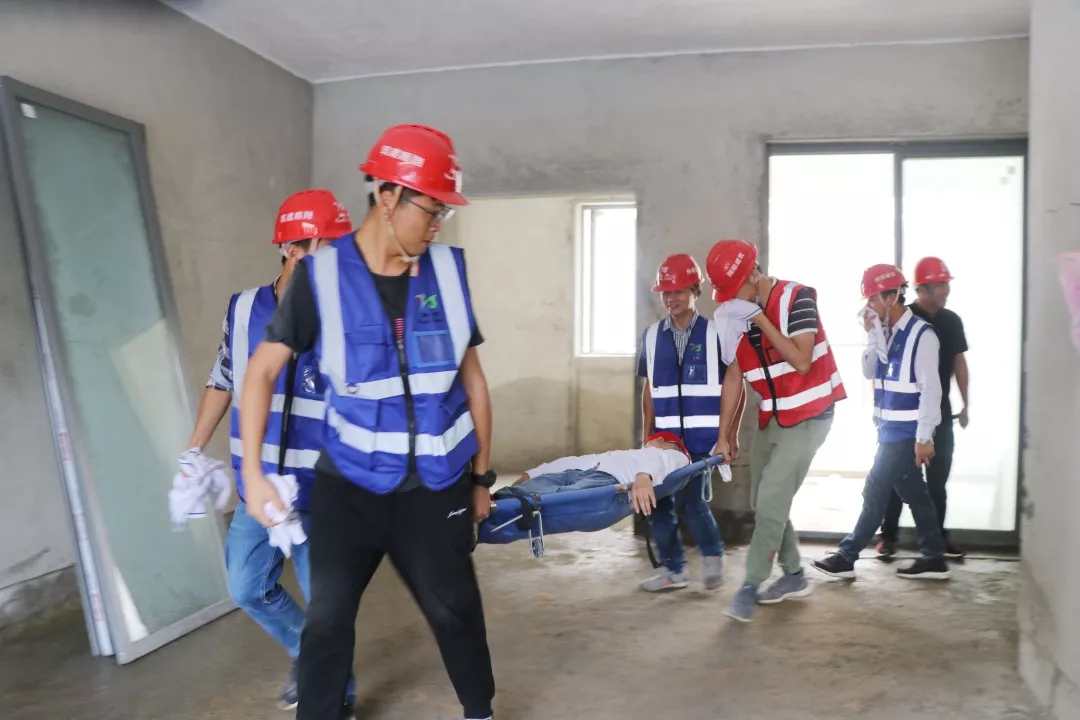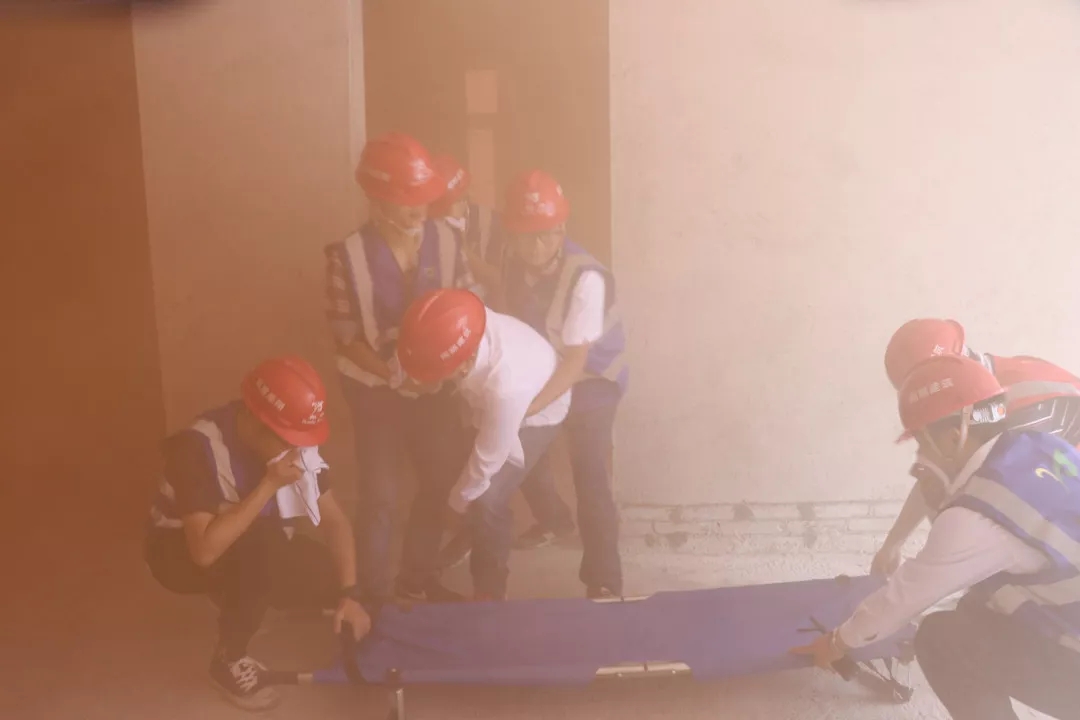 本次應急演練活動,模擬華府項目7#三樓,裝飾班組作業人員龍骨焊接電弧火花引燃地面碎木板導致火情發生,濃煙散發較大,導致一名施工人員在火災現場附近暈厥倒地。