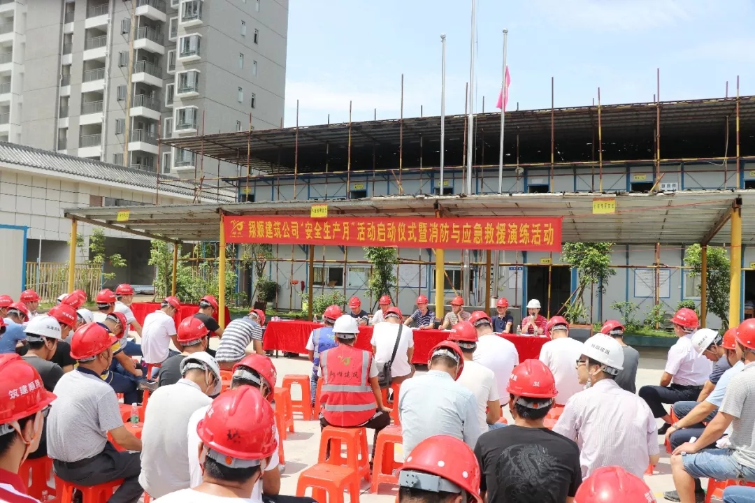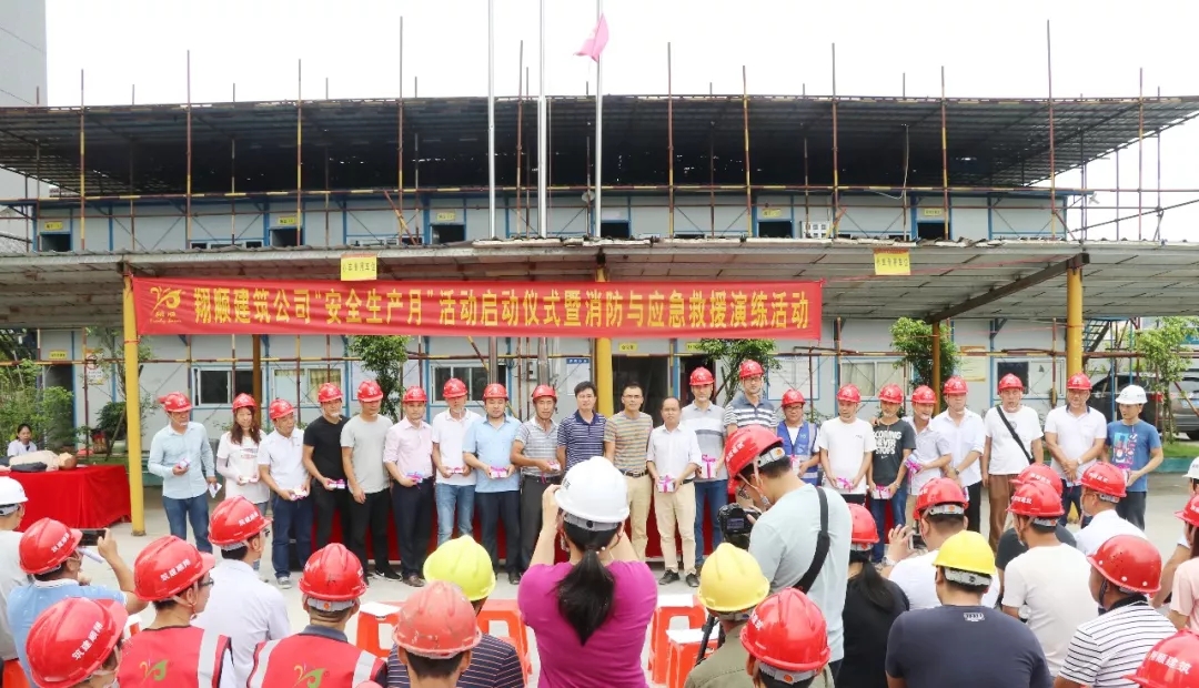 這里正在舉行2019年建筑公司《6月安全活動月》活動啟動儀式及綜合應急預案演練大型活動,縣安監站站長謝偉雄、建筑公司總經理鄒小舟、班子領導及各項目主要管理人員、勞務公司代表超100人參加活動。活動由執法部經理馮根華主持。