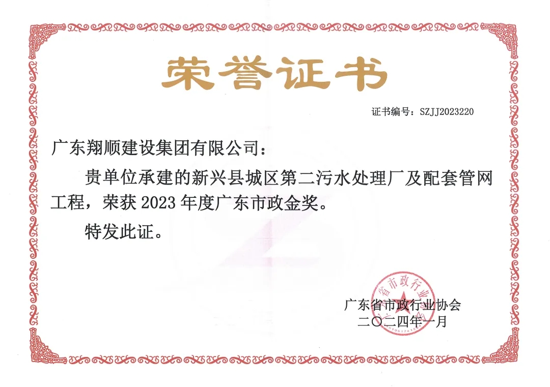 近日,廣東省市政行業(yè)協(xié)會公布了2023年度廣東市政金獎名單,由翔順建設集團承建的“新興縣城區(qū)第二污水處理廠及配套管網(wǎng)工程”項目榮獲“2023年度廣東市政金獎”。廣東市政金獎是廣東省市政行業(yè)的省級最高榮譽獎,體現(xiàn)廣東省市政工程質量的一流水平。