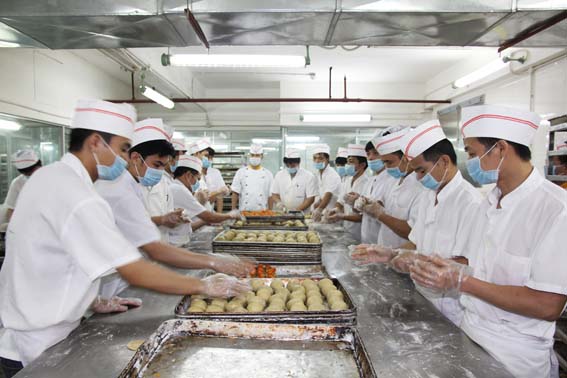 自2011年開始,酒店就按照質監局的要求,在地下室裝修了一個月餅工場,面積約為300平方米。步入廠內恰好遇上同事們的上班時間,只見大家身著白色的工作服,頭戴白帽和口罩,在進場前依次到洗手盆前洗手消毒。場內,工作間使用透明的玻璃墻隔開來,一眼望去,物品的陳列、設備的擺放井井有條,干凈舒適。場內始終開放著空調,據月餅制作負責人梁盛威介紹,這是為了讓辛苦的員工們有一個舒適的工作環境,另外在舒適的溫度加工月餅,品質更加優良。