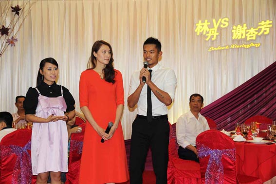 在眾人的期待中,6點15分,林丹謝杏芳十指緊扣步入宴廳的紅地毯。在主持人的熱情主持下,兩人向新興縣的父老鄉親問好致意。昔日在賽場上霸氣十足的“超級丹”在講話時卻顯得有些靦腆,讓大家看到了他的另一面。為表達對家鄉父老的謝意,林丹謝杏芳攜手到每桌敬酒。觥籌交錯間,夫妻倆始終面帶微笑,場面溫馨自然。敬酒結束后兩人匆忙離開,回到龍山翔順大酒店。