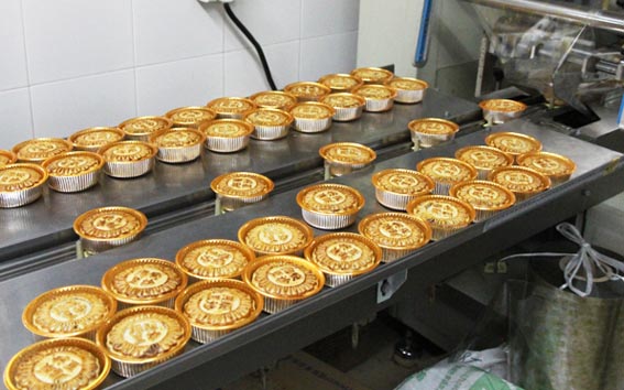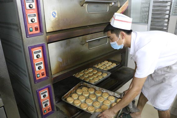 包好餅皮后,就要用成型機壓制成型了。師傅們根據不同餡料的月餅,在成型機上裝上印有對應餡料的模版。由于成型機靠的是感應壓模,月餅放置的位置也很有講究,位置稍有偏差就會壓制不均衡,這時就要重新做過了。制作師傅在壓制時都保證每個月餅大小基本一致,確保質量符合要求。
