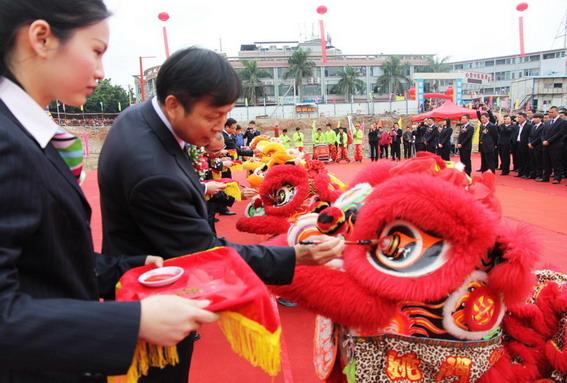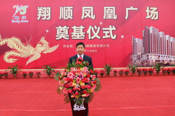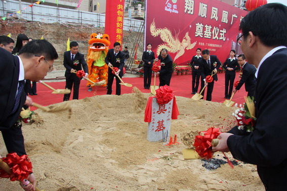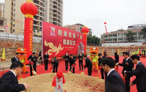 10時許,在醒獅點睛的熱烈氣氛烘托下,集團領導崔健全、鐘世雄、潘錦基、鄺紹榮等共同為鳳凰廣場項目奠基培土,宣告翔順首個商業地產項目正式啟動。