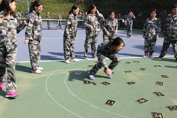 40分鐘后,我們來到了飛天蠶酒店。一下車,滿山的翠綠映入眼簾、清新的空氣撲面而來。正當我們陶醉在大自然美景里時,一聲清脆的哨聲劃破了早晨的寧靜,教官早已在操場上等候我們。原來下車的第一件事不是直奔餐廳吃早餐,而是帶上行李集合,大家不得不連走帶跑唯恐落后于人。集合完畢后就是清點人數及宣布培訓紀律。今年的紀律很嚴,其中最嚴的包括每次集合必須在十秒鐘內完成、上課時坐椅不能靠背、不能帶手機進入課室、就餐時不能講話、遲到一次做十個俯臥撐等,很多同事都被嚇得直吐舌頭。