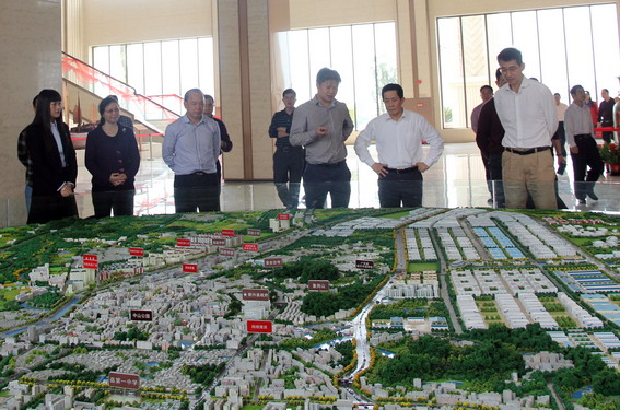 調(diào)研組一行到我集團(tuán)大堂參觀新興縣縣城總體規(guī)劃沙盤模型并聽取縣長唐誼及我集團(tuán)相關(guān)領(lǐng)導(dǎo)關(guān)于縣城總體規(guī)劃、翔順集團(tuán)的產(chǎn)業(yè)布局等情況的講解。調(diào)研過程中,陳世慶與唐誼談起翔順旗下的象窩山。兩位領(lǐng)導(dǎo)熱情高漲地化用宋代詩人王安石的詩句稱贊象窩山“不畏浮云遮望眼,只緣身在象窩中。”