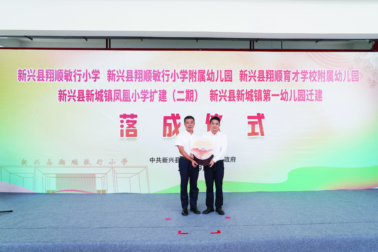 儀式上,陳哲江、賴鑒銘等縣領(lǐng)導(dǎo)在主會場為新興縣翔順敏行小學(xué)等5項工程落成剪彩,翔順敏行小學(xué)附屬幼兒園、翔順育才學(xué)校附屬幼兒園、新城鎮(zhèn)鳳凰小學(xué)、新城鎮(zhèn)第一幼兒園四個分會場的落成儀式同步進行。期間,賴鑒銘為翔順控股集團頒發(fā)“突出貢獻”紀(jì)念品,集團總裁陳彬上臺代表領(lǐng)取。