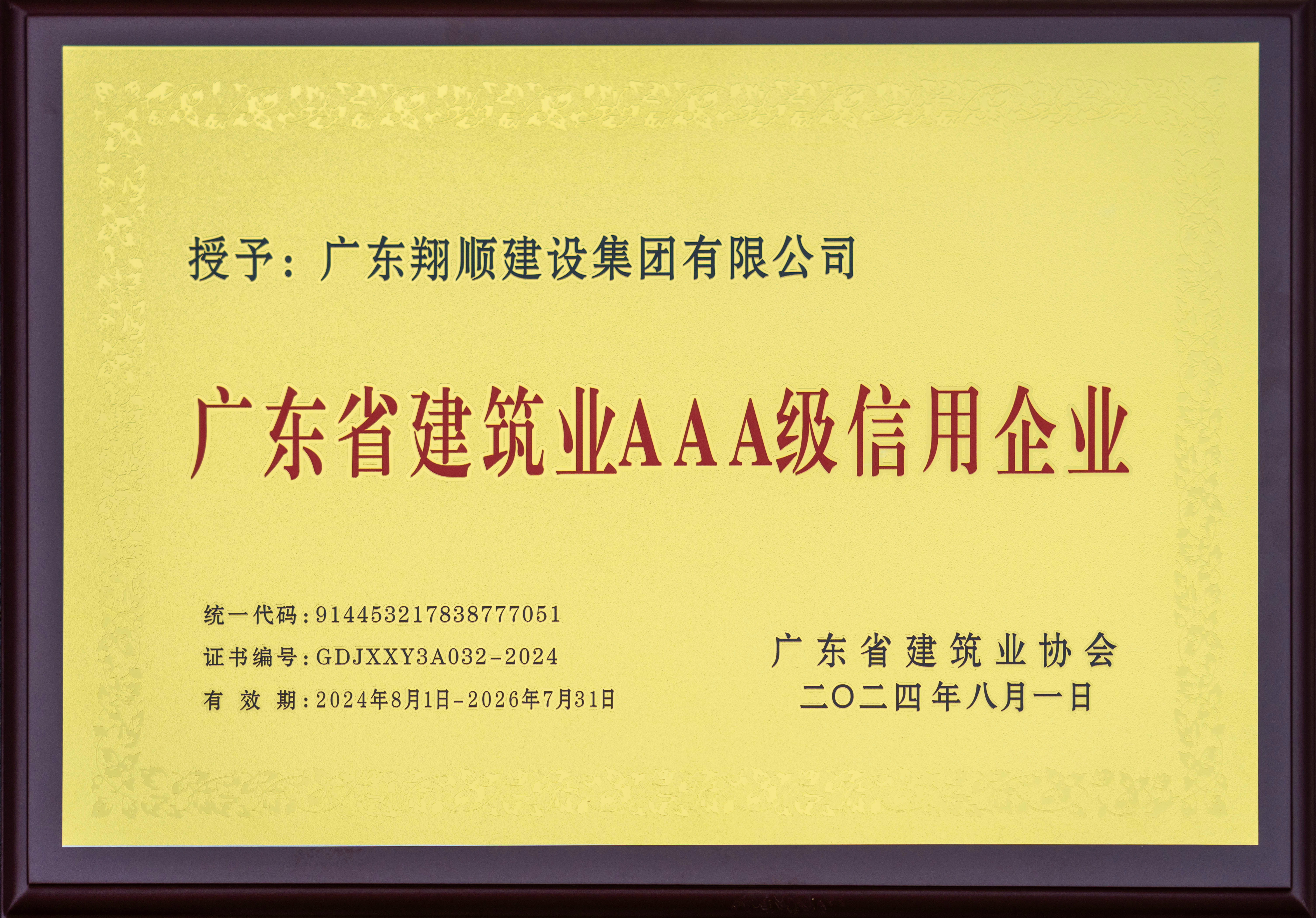 一直以來,翔順建設(shè)始終強(qiáng)化誠信經(jīng)營理念,打造誠信經(jīng)營環(huán)境,持續(xù)推進(jìn)質(zhì)量和品牌建設(shè),公司已榮獲“連續(xù)11年獲得省守合同重信用牌匾”“工程建設(shè)企業(yè)信用評價AAA級企業(yè)”“中國建筑業(yè)AAA級信用企業(yè)”“云浮市2022年重點(diǎn)納稅企業(yè)”等榮譽(yù)稱號。