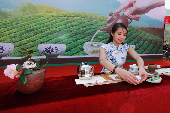 現場,一位舉止優雅的姑娘輕捻之間撥動著古箏琴弦,動聽的古箏樂韻拉開了春茗會的序幕。茶藝師在茶桌前以專業的方法和技巧先后進行選茶、辨水、選具、滌器、投茶、沏茶,每一個動作都巧妙靈活、悠然儒雅,讓人賞心悅目。