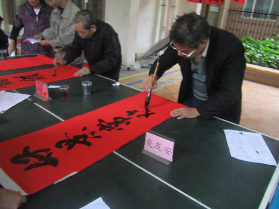 本報(bào)訊 1月15日下午,新興縣書法家協(xié)會(huì)的書法家們,走進(jìn)翔順花園二區(qū),開展“迎新春送春聯(lián)”書畫現(xiàn)場(chǎng)揮毫活動(dòng),受到了社區(qū)居民的熱烈歡迎,為即將到來的龍年增添了喜慶的節(jié)日氣氛。十名書法家各顯身手,行草楷風(fēng)格各異,筆力雄健,氣韻生動(dòng),他們將毛筆飽蘸墨汁,在大紅的對(duì)聯(lián)紙上執(zhí)筆書寫,一句句兼收并蓄、寓意吉祥的辭藻躍然紙上。從下午2點(diǎn)到6點(diǎn),短短的4個(gè)小時(shí)中,他們書寫了500多副喜慶的春聯(lián),當(dāng)場(chǎng)就被居民一“搶”而空。拿到墨寶的居民個(gè)個(gè)喜笑顏開,他們高興地表示,這種親筆書寫的對(duì)聯(lián)不僅有心意,還有濃濃的年味。