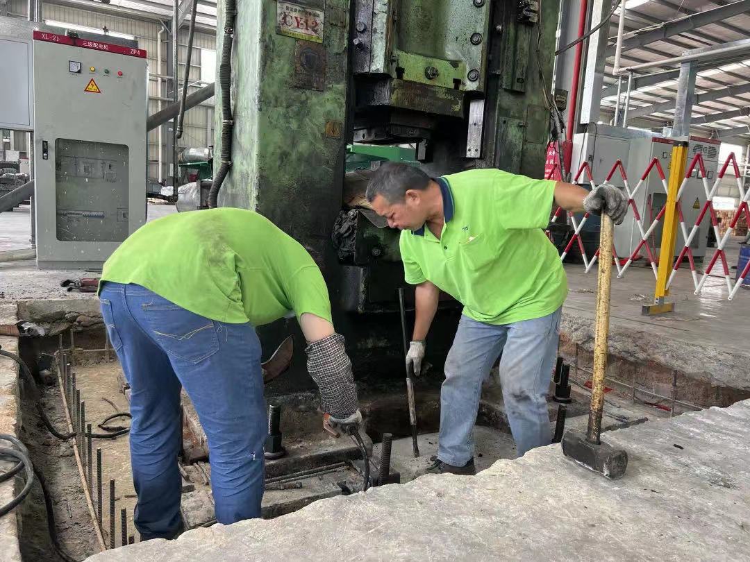 筆者在現場看到,工程中心的老員工“禮叔”正在和同事加緊處理400噸壓力機的底座,他們身上滿是油污,但絲毫不影響工作,他們麻利地進行著焊接,然后給一個個接近小臂粗壯的螺絲進行加固。“要盡快完成生產線后續機器設備的調試安裝才行,避免影響后面的進度。”禮叔雖然年紀偏大,但是工作十分積極和賣力,他可是公司的老師傅,周六還依然奮戰在一線。